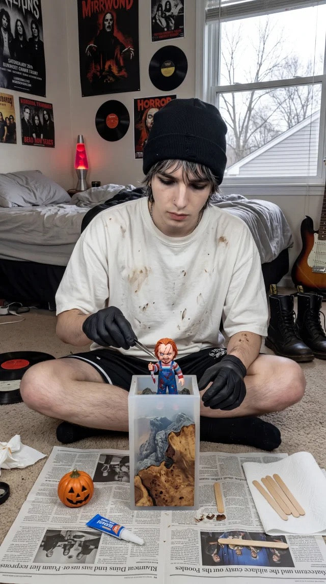 Hi, I’m a resin artist and the only hands behind every lamp. I grew up lost in Halloween stories, passed down through movie nights and family. Those days stayed with me. Every lamp is cut, poured, and finished alone in my workshop. No factory. No team. Just wood, resin, and stubborn love for the craft — shaped by the stories that raised me.